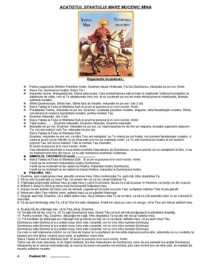 Acatistul sfantului mare mucenic mina.. Amin slavă ţie, dumnezeul nostru, slavă ţie! Acatistul sfantului mare mucenic mina rugaciunile incepatoare : In numele tatalui si al fiului si al sfantului duh, amin. Mare mucenic mina rugăciunile începătoare : Acatistul sfantului mare mucenic mina. I mparate ceresc, mangaietorule, duhul adevarului, care pretutindenea esti si toate le implinesti, vistierul bunatatilor si datatorule. S lava tie, dumnezeul nostru, slava tie! Acatistul sfantului mare mucenic mina.