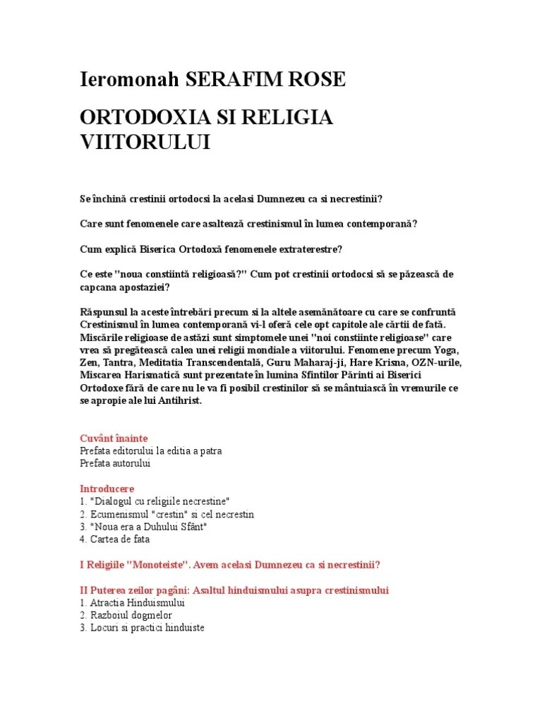 Cuvânt înainte cartea de fată, intitulată ortodoxia şi religia viitorului, pe care o publicăm în traducere românească, a fost scrisă în anul 1972, de ieromonahul serafim rose (+1982), vestit ascet şi scriitor bisericesc, vietuitor din obstea mânăstirii sfântul paisie din nordul californiei. . Pe masura ce forme de falsa spiritualitate se raspândesc din ce în ce mai mult si pun stapânire pâna si pe oameni care se declara crestini ortodocsi, ne înfioram la privelistea acestei amagiri careia îi pot cadea prada crestinii.